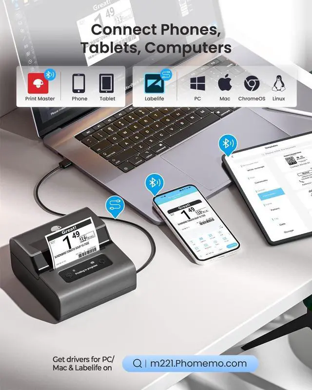 MADE FOR PHONE, TABLETS & COMPUTERS: Phomemo M221 bluetooth thermal label maker machine with tape is equipped with stable Bluetooth 4.2, making it compatible with phones and tablets, allowing for quick connection within just 2 seconds. Additionally, the label printer can be connected to a macOS or Windows computer via USB