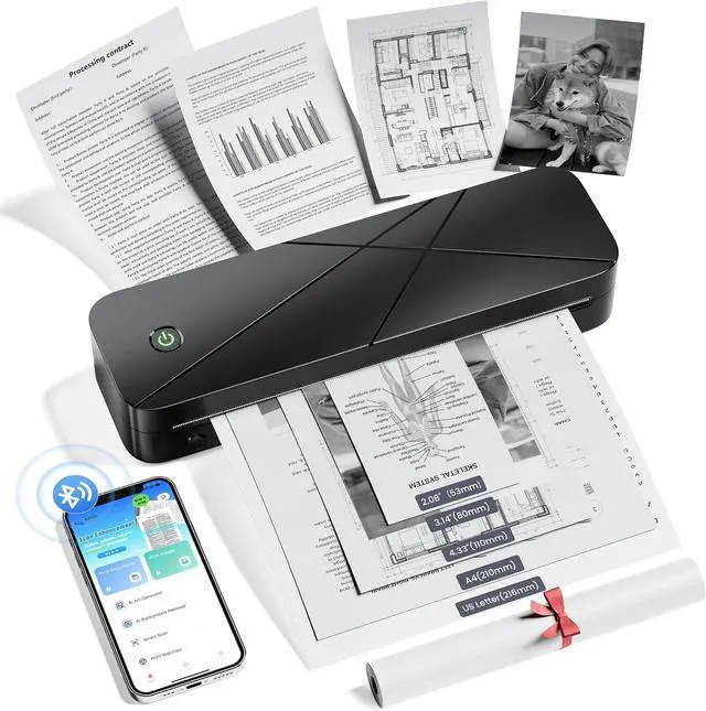 One Machine, Multiple Uses - Supports Diverse Sizes and Paper Types for Family Sharing: Laptop printer features a built-in paper bin, supporting thermal roll paper, continuous, and single sheet thermal paper. It supports 5 thermal paper sizes: 8.5"x11" US Letter, A4, 4.33" (110mm), 3.14" (80mm), and 2.08" (53mm). Perfect for printing documents, contracts, invoices, study notes, images and boarding passes anytime. Ideal for home and office use