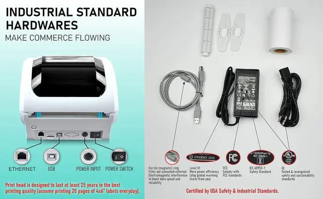 High speed shipping label printer for Windows, Apple Mac Computer / MacOS, Chromebook / ChromeOS & Android via USB connection & Ethernet network connection, also supports iOS/iPhone/iPad network connection printing. Direct thermal technology will never require to refill ink toner. It supports Arkscan's labels, Zebra compatible and Arkscan compatible labels. All shipping labels from UP and Fedex are supported. Most common shipping labels in size 4x6 inches, 4x8.25 inches and 4x6.75 inches are supported.