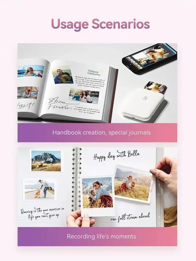 Instant Printing: The portable 2x3 "photo printer creates vivid color prints in an instant. Connect to your mobile device via Bluetooth 5.0 to quickly print out photos, record beautiful landscapes and daily life