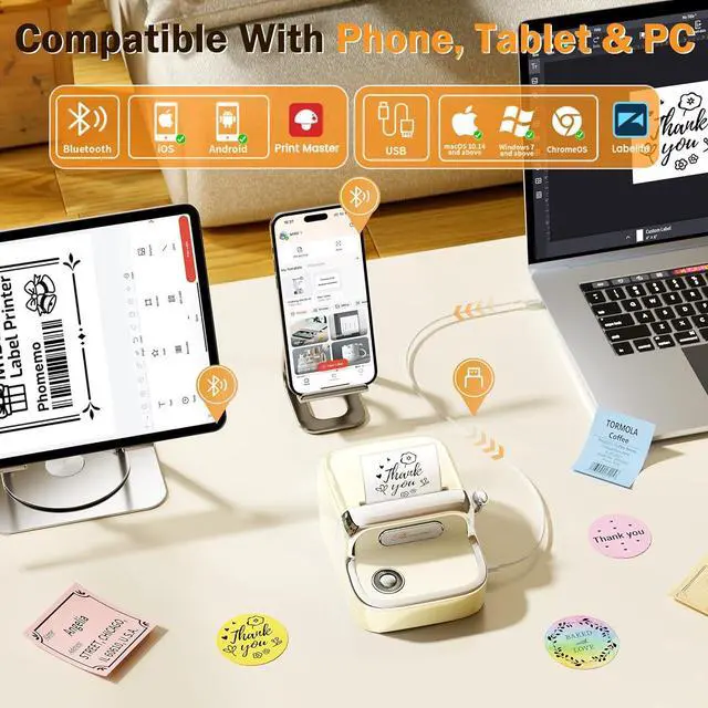 Strong CompatibilityPhomemo M150 wireless address label maker is compatible with smartphones, tablets (iOS and Android systems), and computers (Windows, macOS, Linux). To use it with a smartphone or tablet, download the Print Master App from Google Play or App Store, then print by connecting via Bluetooth. For use with a computer, visit the official website to download drivers and the Labelife app, then connect and print using a USB data cable