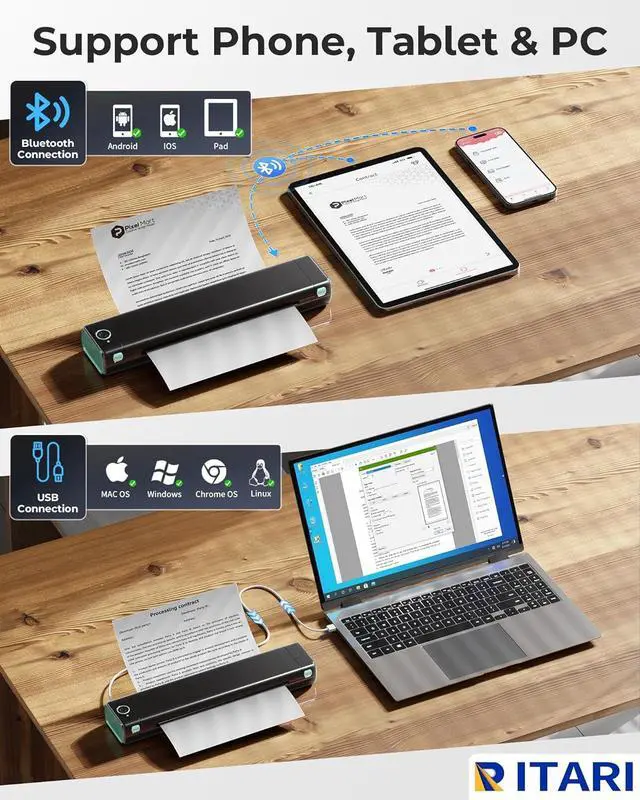 Bluetooth and Wireless Printer:Itari travel printer adopts the most advanced Bluetooth wireless connection method, you can connect the printer through your mobile phone anytime, anywhere, no longer limited by the place.This portable printer for laptop also support USB connection for MacOS and Windows and Chrome