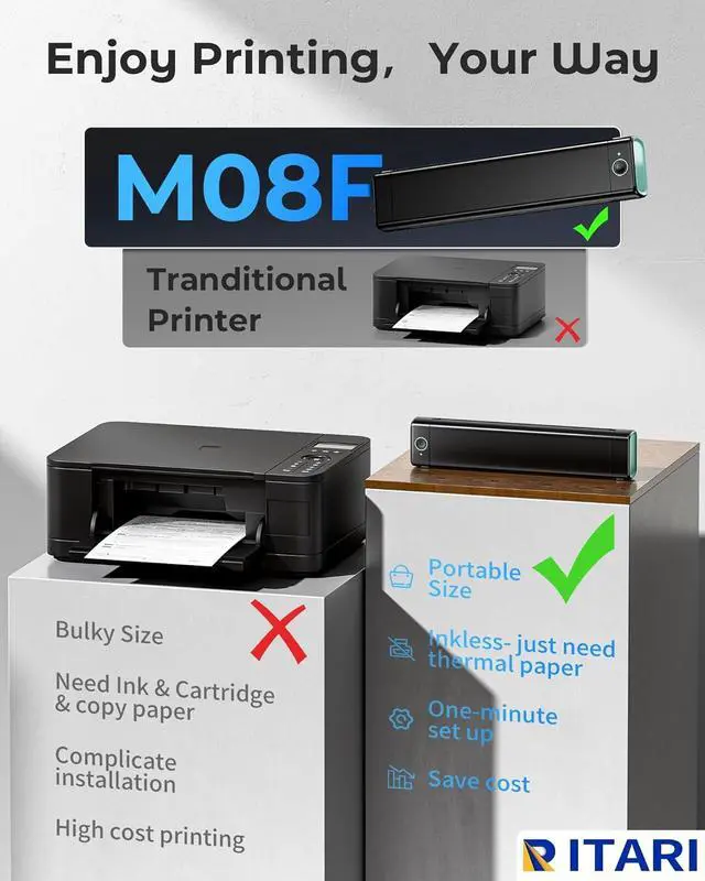 No ink Printer: M08F-Lettter inkless printer, using advanced Direct Thermal Printing Technology,provides clear text every time. This impresora portatil is more environmentally friendly and safer because it needs no ink,toner and ribbon. (ATTENTION: This printer only support thermal paper not regular paper