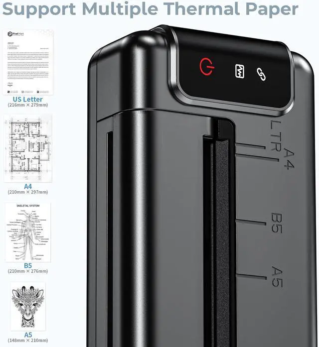 Inkless Portable Printer with Multi-size Printing:Featuring an adjustable paper guide clip, our printer allows you to print on thermal paper or thermal labels with widths of 8.5"/8"/7"/5.8" (US Letter/A4/B5/A5), making it suitable for a wide range of applications including documents, photos, greeting cards, address labels, clipart, and more. (Only supports monochrome printing!)