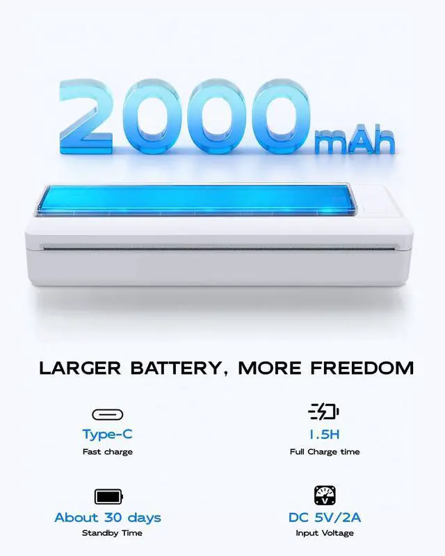 Long Battery Life + Fast Type-C Charging: The built-in 2000mAh rechargeable battery powers long days of mobile printing. Charges fully in about 1.5 hours via Type-C. The 30-minute auto-shutdown helps preserve powerideal for travel, field work, and life on the move