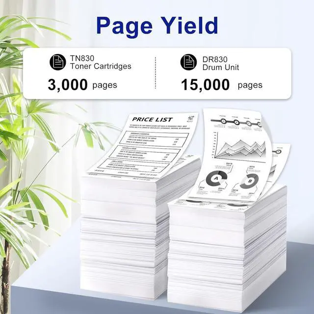 DR830 Drum+TN830XL Toner Cartridges 3 Pack Durable and High Print Volume: Tested for durability, DR830 Drum Unit +TN830XL Toner Cartridges offers a high print yield, supporting up to [15,000] pages for DR830 Drum Unit,[3,000] Pages for TN830 XL/V/R Toner Cartridge at 60% lower cost per page (A4, standard mode). It reduces the frequency of replacements, lowering long-term costs and making it a perfect choice for high-volume printing needs