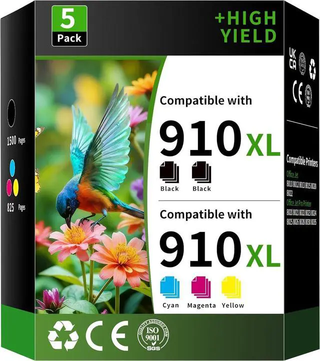 Package Contents: 5 Pack High Yield 910XL Ink Cartridge Compatible Replacement for HP910XL HP910 910 XL ( 2 Black + 1 Cyan+1 Magenta+1 Yellow)