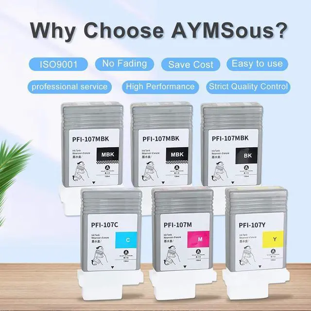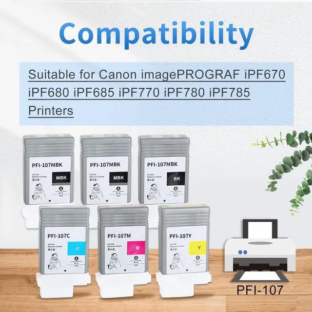 You Can Receive: 6 Pack Compatible Ink Cartridge Replacement for Canon PFI-107 PFI107 PFI-107MBK PFI-107BK PFI-107C PFI-107M PFI-107Y (2 Matte Black/1 Black/1 Cyan/1 Magenta/1 Yellow)