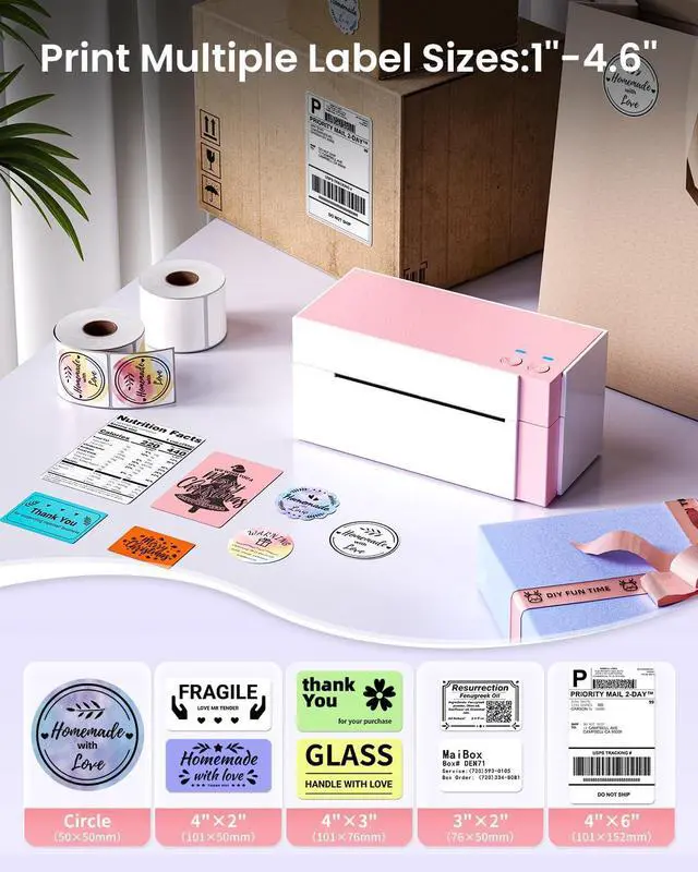[Compact Size&Label Compatibility] Length: 7.18'; Width: 3.48'; Height: 3.52'';Space-saving.The shipping label printer works with both fanfold labels and roll labels. It supports label widths from 1" to 4.6", meeting various labeling needs for shipping and daily use,you can print shipping labels,thank you logo/DIY logo/QR code/address labels, and more!