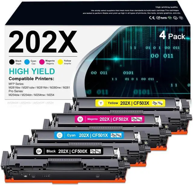 Package Contents4 Pack 202X Toner Cartridges (1 Black, 1 Cyan, 1 Yellow, 1 Magenta)