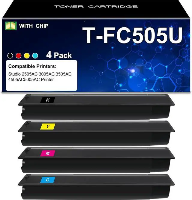Package: 1 x Black T-FC505U-K Toner Cartridge, 1 x Cyan T-FC505U-C Toner Cartridge, 1 x Magenta T-FC505U-M Toner Cartridge, 1 x Yellow T-FC505U-Y Toner Cartridge, total 4 PACK