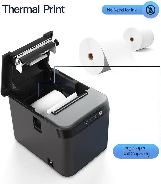 Efficient & Affordable Printing: Our 80 receipt printer is designed for high efficiency, with a fast printing speed of up to 200mm/sec. It features an auto cutter for easy paper cutting and requires no ink cartridges or ribbons, resulting in low operation costs. Additionally, the thermal print head ensures clear printing, and thermal paper is readily available.