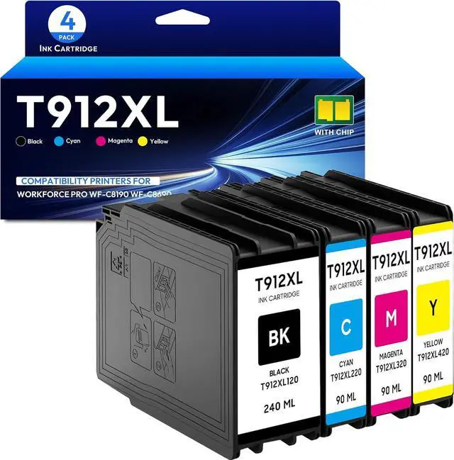 Package includes: 1 x T912XL120 black ink cartridge, 1 x T912XL220 cyan ink cartridge, 1 x T912XL320 magenta ink cartridge, 1 x T912XL420 yellow ink cartridge replacement for T912 ink cartridge, T912xl ink cartridge.