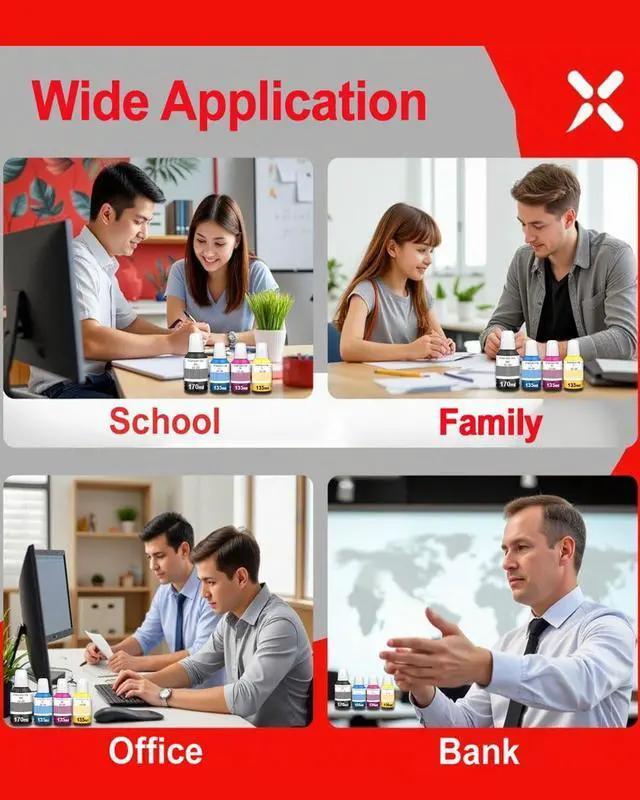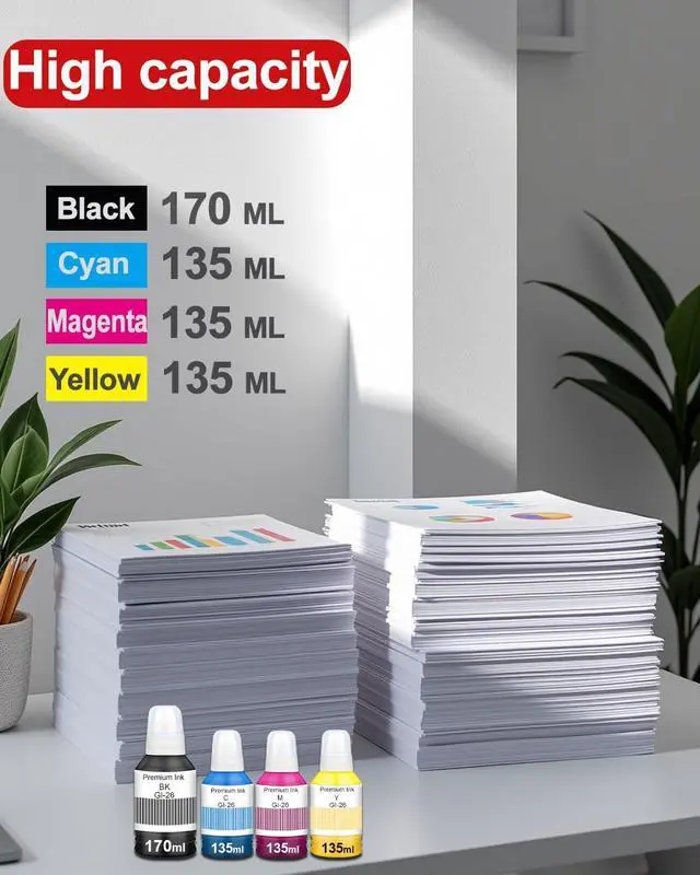 High Capacity: The capacity is 170ML per black ink bottle and 135ML per color ink bottle. 10500 pages per black ink bottle and 14000 Pages per color ink bottle at 5% Coverage (Letter /A4).