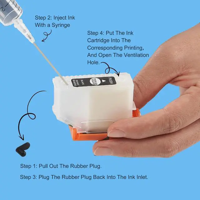 Suggestion: Empty ink cartridges can only contain 90% ink, so as to prevent the ink from overflowing and polluting the printer during use. And be sure to unplug the rubber plug of the ventilation hole during use.If your printer is brand new and you have not used the original ink cartridge, please first install the original ink cartridge and initialize the printer so that your new printer can recognize and use our ink cartridge. If you have any questions about this product, please feel free to contact us
