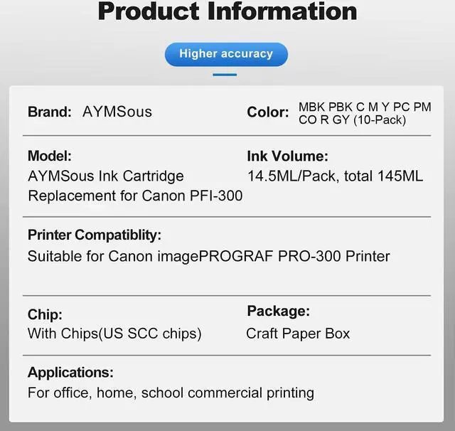 Ink Volume: Total ink volume is 145ml(14.5ml/pack, total 10-pack) which include 1 pack PFI-300MBK PFI-300 Matte Black (Pigment ink), 1 pack PFI-300PBK PFI-300 Photo Black (Pigment ink),1 pack PFI-300C PFI-300 Cyan (Pigment ink),1 pack PFI-300M PFI-300 Magenta (Pigment ink), 1 pack PFI-300Y PFI-300 Yellow, 1 pack PFI-300PC PFI-300 Photo Cyan (Pigment ink), 1 pack PFI-300PM PFI-300 Photo Magenta (Pigment ink), 1 pack PFI-300C0 PFI-300 Chroma Optimizer (Pigment ink),1 pack PFI-300R PFI-300 Red (Pigment ink), 1 pack PFI-300GY PFI-300 Gray (Pigment ink)