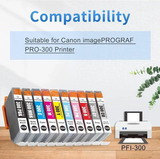 You Can Receive: 10-Pack Compatible Ink Cartridge Replacement for Canon PFI-300 PFI300 (1 Matte Black/ 1 Photo Black/ 1 Cyan/1 Magenta/1 Yellow/1 Photo Cyan/ 1 Photo Magenta/ 1 Chroma Optimizer/ 1 Red/ 1 Gray)