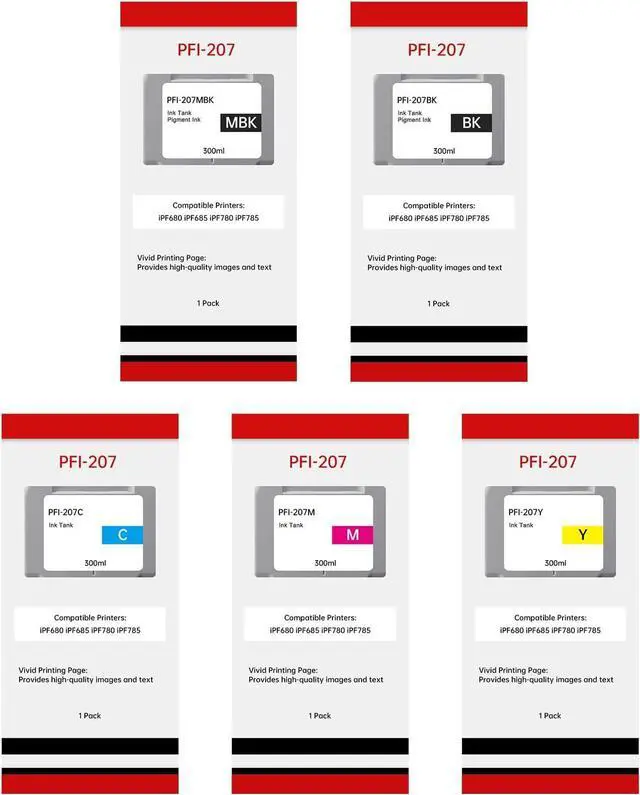 Package Contents: 5 Pack PFI-207 Ink cartridge; 1 x Matte Black (PFI-207MBK), 1 x Black (PFI-207BK), 1 x Magenta (PFI-207M), 1 x Cyan (PFI-207C), 1 x Yellow (PFI-207Y)