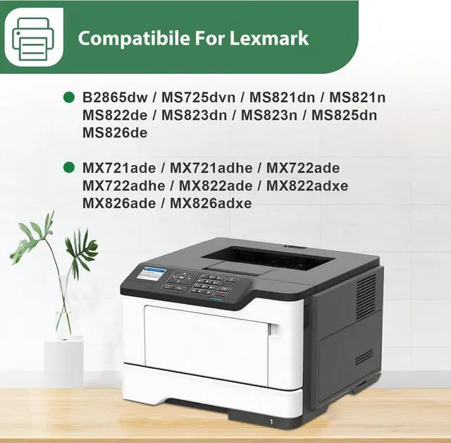 Printer Compatibility: Compatible with Lexmark imaging unit for a B2865 printer, MS821 Drum Unit, MS823 Black Imaging Drum, MS725dvn, MS821dn, MS821n, MS822de, MS823dn drum, MS823n Imaging Unit, MS825 Print Drum, MS825dn, MS826de, MX721ade, MX721adhe, MX722ade, MX722adhe, MX822ade, MX822adxe, MX826ade and MX826adxe Printer