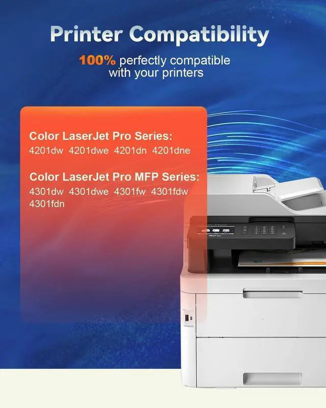 Printer Compatibility:210A toner cartridge Compatible for Color Laserjet Pro MFP 4301fdw, Color Laserjet Pro MFP 4301fdn, Color Laserjet Pro 4201dw, Color Laserjet Pro MFP 4201dn Printer.