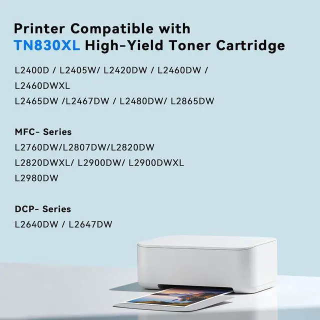 TN830XL Broad Compatibility with Brother Printers: TN830XL TN830 Toner Compatible for Brother HL-L2460DW, HL-L2405W, DCP-L2640DW, HL-L2400D, MFC-L2820DW, HL-L2420DW, HL-L2460DWXL, HL-L2465DW, HL-L2467DW, HL-L2865DW, HL-L2480DW, DCP-L2647DW, MFC-L2760DW, MFC-L2807DW, MFC-L2820DWXL, MFC-L2900DW, MFC-2900DWXL, MFC-L2980DW printers