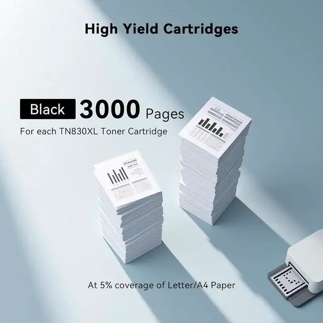 TN830XL High Page Yield: Each tn830xl toner for brother printer delivers an impressive yield of up to 3,000 pages at 5% coverage on A4/Letter-sized paper, helping you stay productive while reducing the hassle of frequent replacements