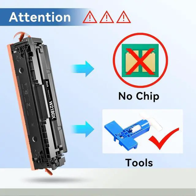 Without Chips: There are No Chips in our MYTONER W2180X 218X Toner Cartridges 4 Pack Set, but we Provide Tools to Remove The Chip From The OEM Toner Cartridge, Please Refer to the Pictures or Video on Our Details Page for DetailedInstallation Guidance.