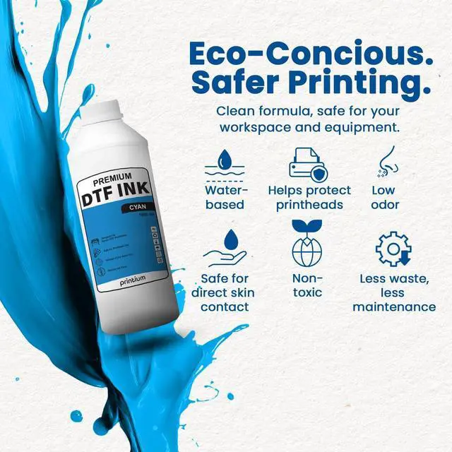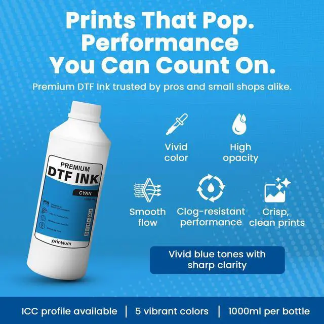 VIVID CYAN DTF INK FOR BRILLIANT PRINTS : Printium DTF Ink Cyan delivers bold, vibrant blue tones for professional-grade results on both dark and light garments. Designed for PET film heat transfer printing and DTG-converted printer systems, it ensures smooth gradients, rich color depth, and long-lasting vibrancy on cotton, polyester, blends, jeans, leather, nylon, and canvas. Perfect for t-shirts, hoodies, tote bags, and large-scale custom DTF projects.