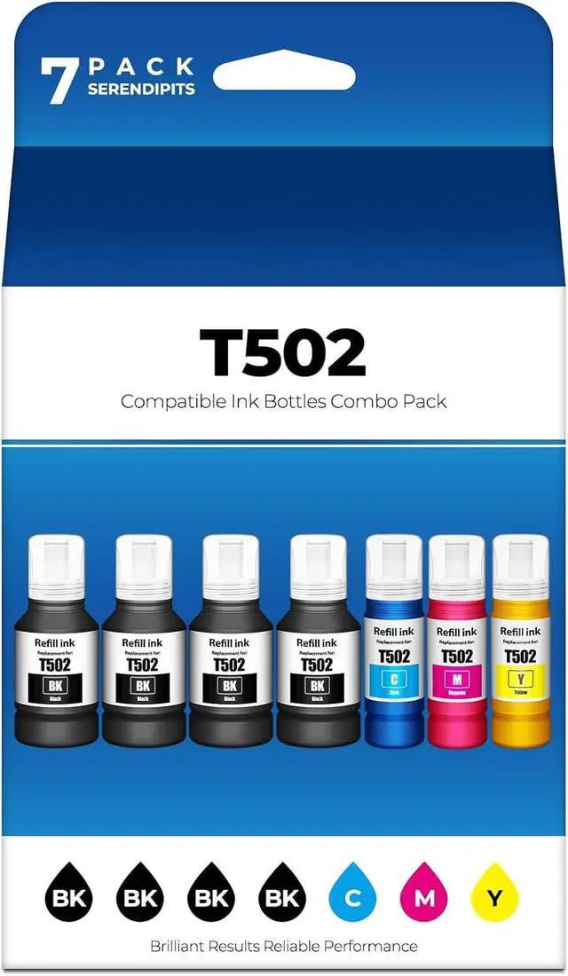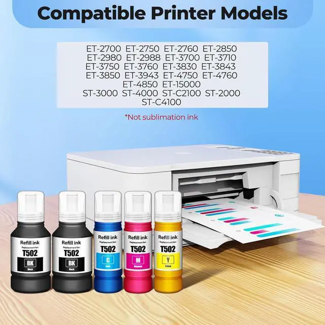502 Ink Refill Bottles Compatible Printers, compatible with ET-2850, ET-3850, ET-15000, ET-4850, ET-3843, ET-2760, ET-4760, ET-2750, ET-4750, ET-3700, ET-3750, ST-C4100, ET-2700, ST-2000, ST-3000, ET-3710, ET-3760, ST-4000, ST-C2100 502 Printer Ink