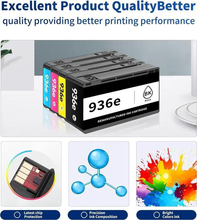 Package Contents: 4 Pack High Yield 936e Ink Cartridge Compatible Replacement for HP936e HP936 936 e ( 1 Black + 1 Cyan+1 Magenta+1 Yellow)