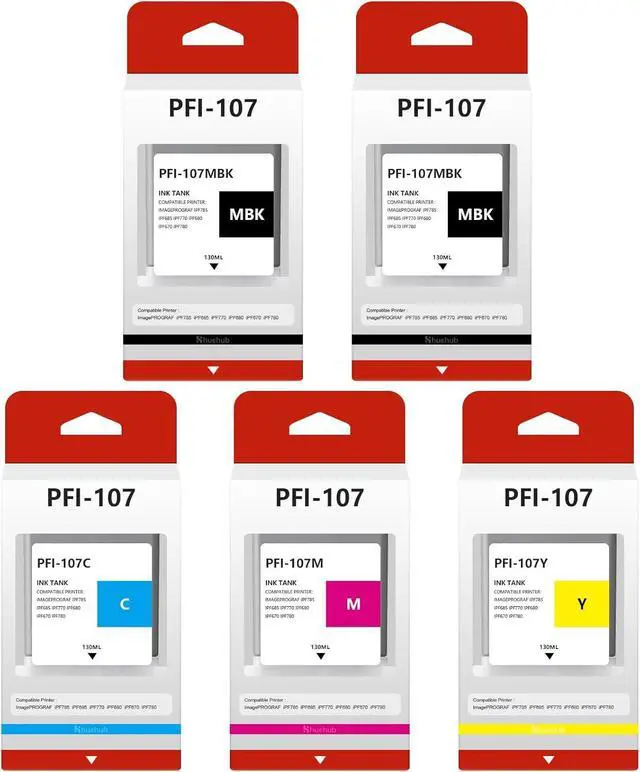 Package Contents: 1 x Matte Black PFI-107MBK, 1 x Black PFI-107BK, 1 x Cyan PFI-107C, 1 x Magenta PFI-107M, 1 x Yellow PFI-107Y, 5 Pack PFI-107 Ink Cartridges