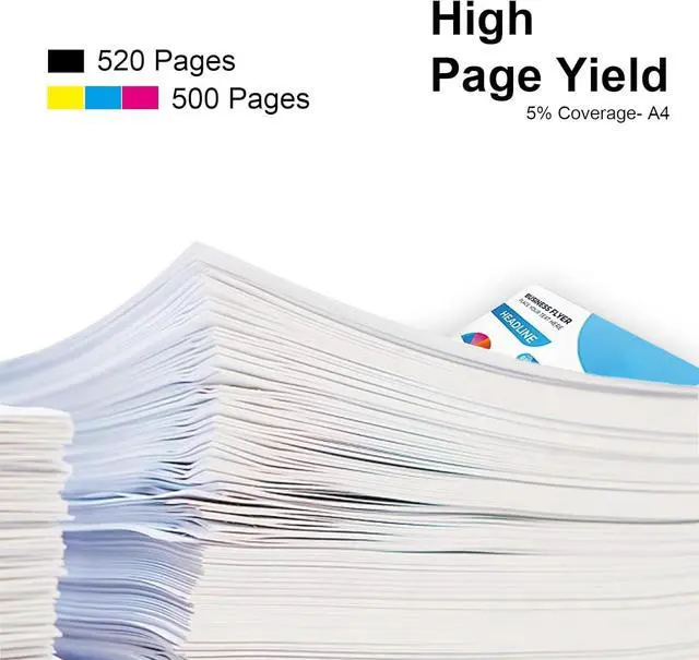 High Page Yield: Black 520 pages, Color 500 pages at 5% coverage (letter/A4)