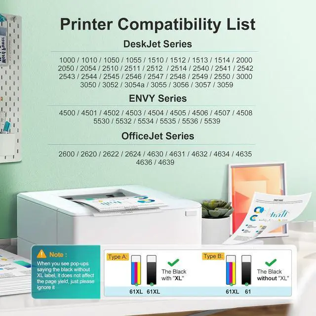 61XL Compatible with HP DeskJet Series: 1000, 1010, 1011, 1012, 1015, 1050, 1050A, 1051, 1055, 1056, 1510, 1511, 1512, 1513, 1514, 1517, 2000, 2050, 2050A, 2050s, 2054A, 2510, 2511, 2512, 2514, 2540, 2541, 2542, 2543, 2544, 2545, 2546, 2547, 2548, 2549, 3000, 3050, 3050A, 3051A, 3052A, 3054, 3054A, 3055A, 3056A, 3057A, 3059A, 3060, 3510, 3511, 3512, 3516