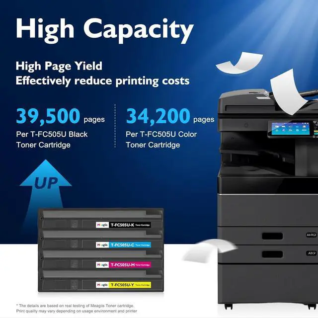 Page Yield: 39,500 Pages for Toshiba T-FC505U-K Black Toner Cartridge, 34,200 Pages per T-FC505U-C T-FC505U-M T-FC505U-Y Toner at 5% coverage (Letter/A4), ideal for users with high-volume printing needs and reducing frequent replacement