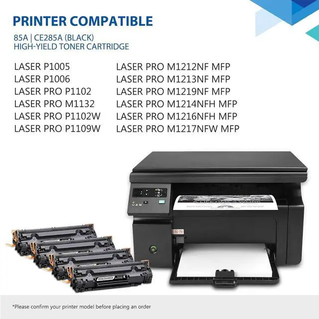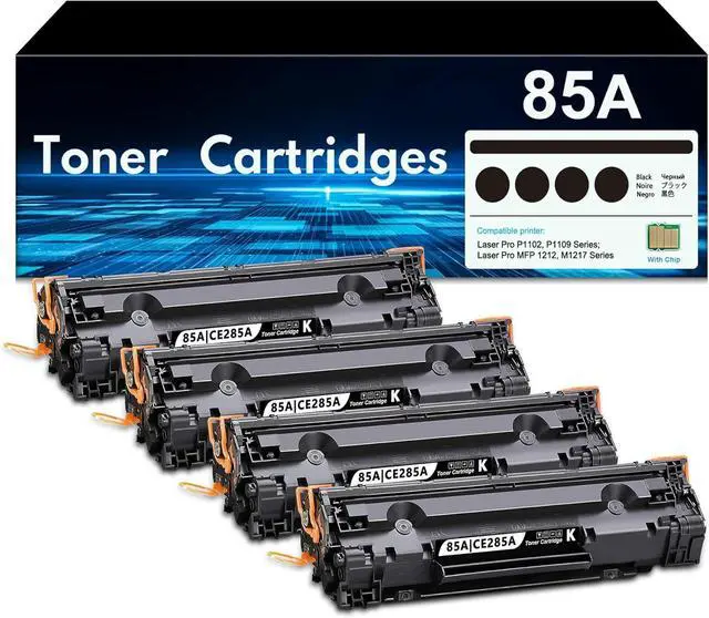 What's in the box: 4 new 85A CE285A Black Toner Cartridges with Chip 4-Pack (also compatible with 35A CB435A 36A CB436A Toner Cartridge)