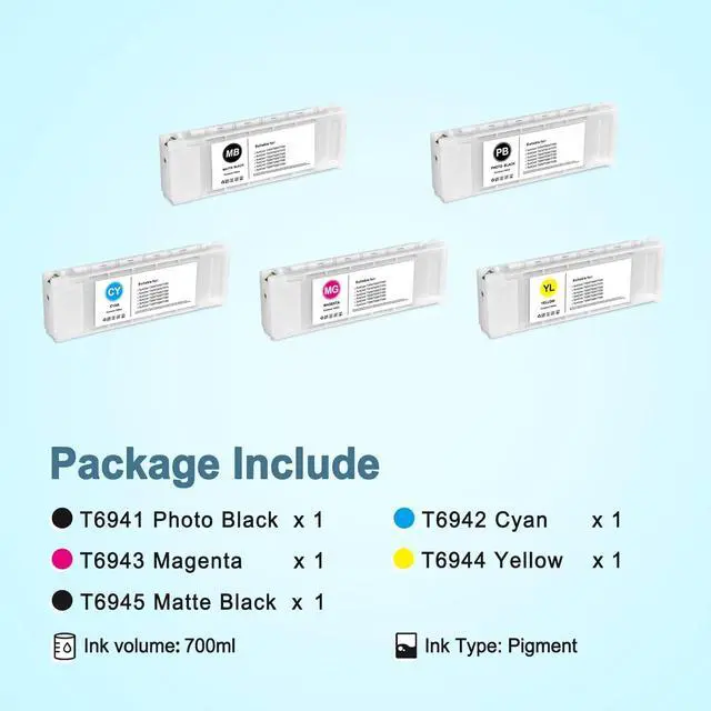 Package Content: 1 x T6941, 1 x T6942, 1 x T6943, 1 x T6944, 1 x T6945, Each ink cartridge has a capacity of 700ml
