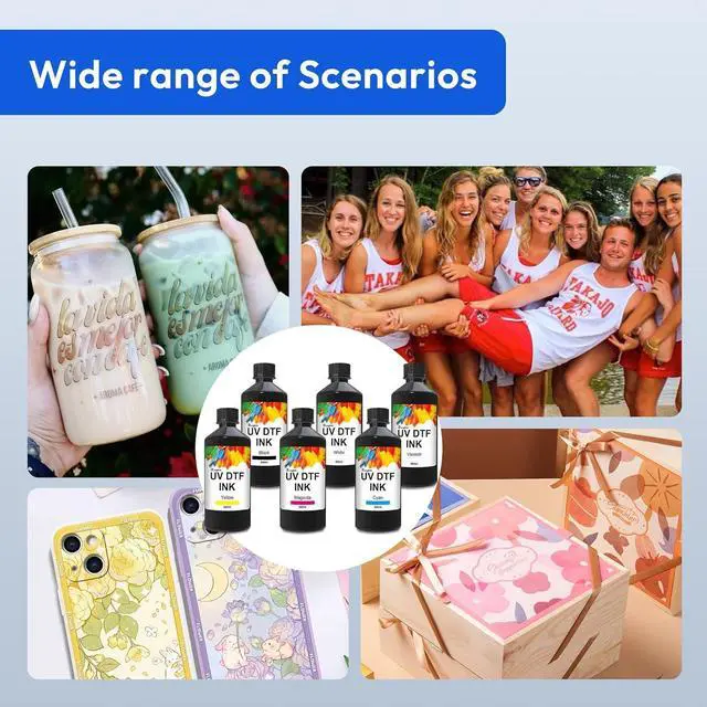 Package includes: 6 Bottles - 1 x UV DTF White Ink, 1 x UV DTF Black Ink, 1 x UV DTF Cyan Ink, 1 x UV DTF Magenta Ink, 1 x UV DTF Yellow Ink, 1 x UV DTF Varnish Ink replacement for UV DTF Ink Bottle.