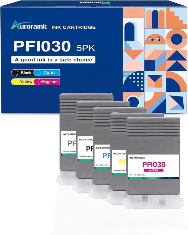 Package Contents: PFI-030 ink cartridge set replacement for Canon PFI-030 PFI030 ink cartridges: 1 x Matte Black (PFI-030MBK), 1 x Black (PFI-030BK), 1 x Magenta (PFI-030M), 1 x Cyan (PFI-030C), 1 x Yellow (PFI-030Y)