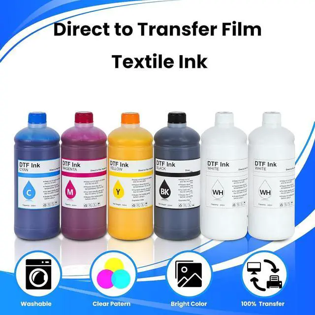 The Package Contains: DTF Ink 500ML 6-Pack 2 White, 1 Black, 1 Cyan, 1 Magenta, 1 Yellow