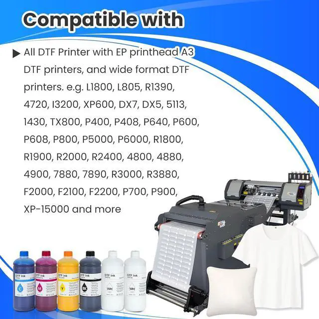 Compatible with All DTF Printer with printhead A3 DTF printers, and wide format DTF printers. e.g. L1800, L805, R1390, 4720, I3200, XP600, DX7, DX5, 5113, 1430, TX800P400, P408, P640, P600, P608, P800, P5000, P6000R1800, R1900, R2000, R2400, 4800, 4880, 4900, 7880, 7890, R3000, R3880, F2000, F2100, F2200, P700, P900, XP-15000 and more