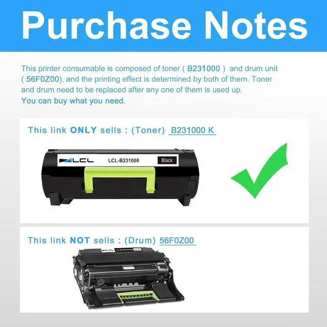 Reliable Quality: LCL B231000 cartridge uses high quality toner, toner particle size distribution, good mobility, high transfer rate, resulting in a clear image and high gloss print effect; Printing efficiency is high, waste powder rate is low, so as to ensure sufficient page yield.