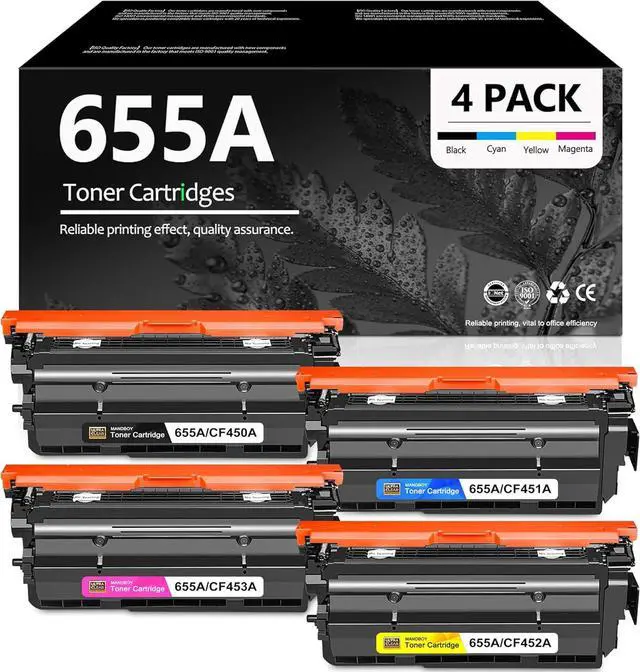 • This 4 Pack 655A Toner Cartridges Contains: 1 x CF450A (655A) Black Toner Cartridge,1 x CF451A (655A) Cyan Toner Cartridge,1 x CF453A (655A) Magenta Toner Cartridge,1 x CF452A (655A) Yellow Toner Cartridge