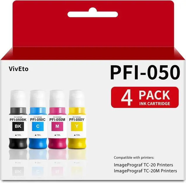 Contents: VivEto ink replacement for Canon PFI-050 PFI050 ink tank; 4-Pack color PFI 050 ink cartridge (PFI-050BK Black, PFI-050C Cyan, PFI-050M Magenta, PFI-050Y Yellow)