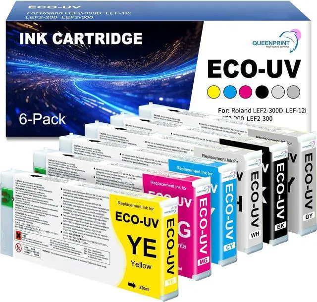 Complete 6-Color EUV2 Ink Set: Includes six 220ml cartridges (WH, Y, M, C, BK and GL). Our Eco-UV Version 2 ink delivers vibrant, high-density prints with exceptional color consistency on diverse materials.