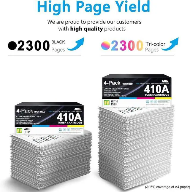 High Page Yield: 410A toner cartridges 4 pack Up to 2,300 Pages for 410A Black Toner Cartridge, up to 2,300 Pages for 410A Color Toner Cartridge(at 5% coverage on Letter/A4 size)