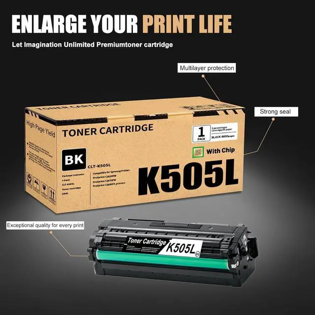 Package Contents: 1 Pack CLT-K505L Black Toner Cartridge.