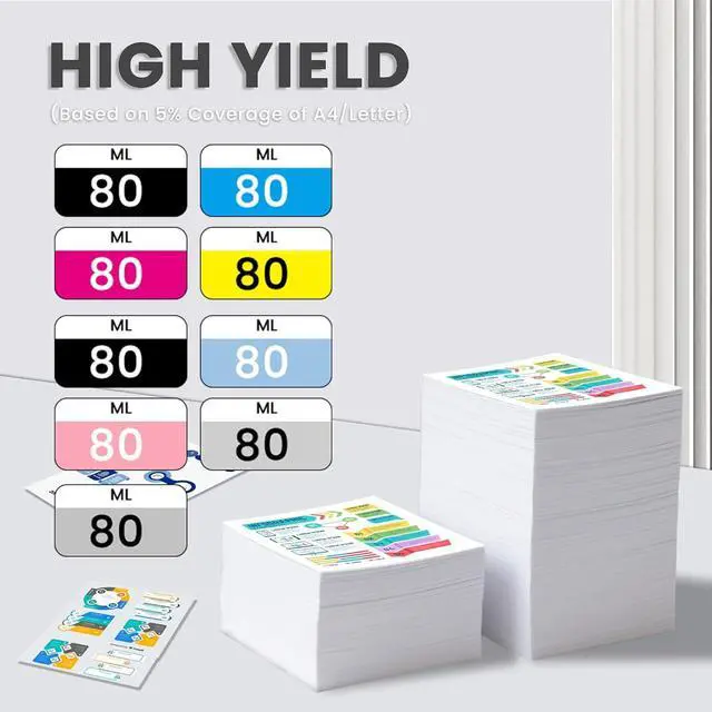 High Capacity Yield Pages: T580 ink cartridge up to 80ml for black, up to 80ml for colors, based on 5% coverage of A4/Letter