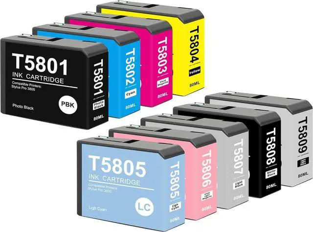 Remanufactured T580 Ink Cartridge: T580 ink cartridge with 9 pack (T5801 Photo Black, T5802 Cyan, T5803 Magenta, T5804 Yellow, T5805 Light Cyan, T5806 Light Magenta, T5807 Light Black, T5808 Matte Black, T5809 Light Light Black), upgraded materials and chip bring the perfect printing experience