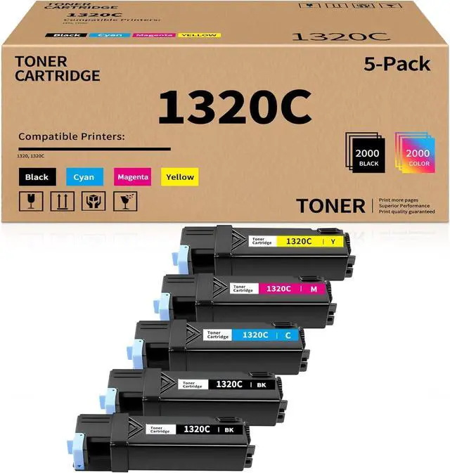 Package Contents: 5 Pack High Yield 1320C Toner Cartridge Compatible Replacement for Dell 1320C KU052 KU053 KU054 KU055 310-9058 310-9060 310-9062 310-9064 ( 2 Black +1 Cyan +1 Magenta +1 Yellow )
