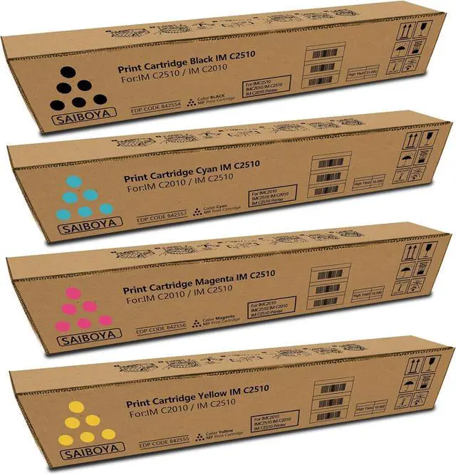 Package includes: Complete 4-Pack IMC2510 / IMC2010 Toner Set (Black Cyan Magenta Yellow) for IM C2510 Toner Cartridge,IM C2010 Toner Cartridge